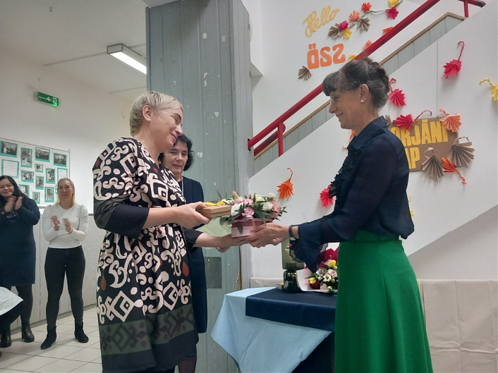 2024-ben a tantestület döntése értelmében Román Katalin gyógypedagógus részesült Doborjáni Emlékéremben. Sajnos az időjárás nem kedvezett a kültéri programoknak, ezért kivetített képek segítségével tartottuk meg koszorúzásunkat.